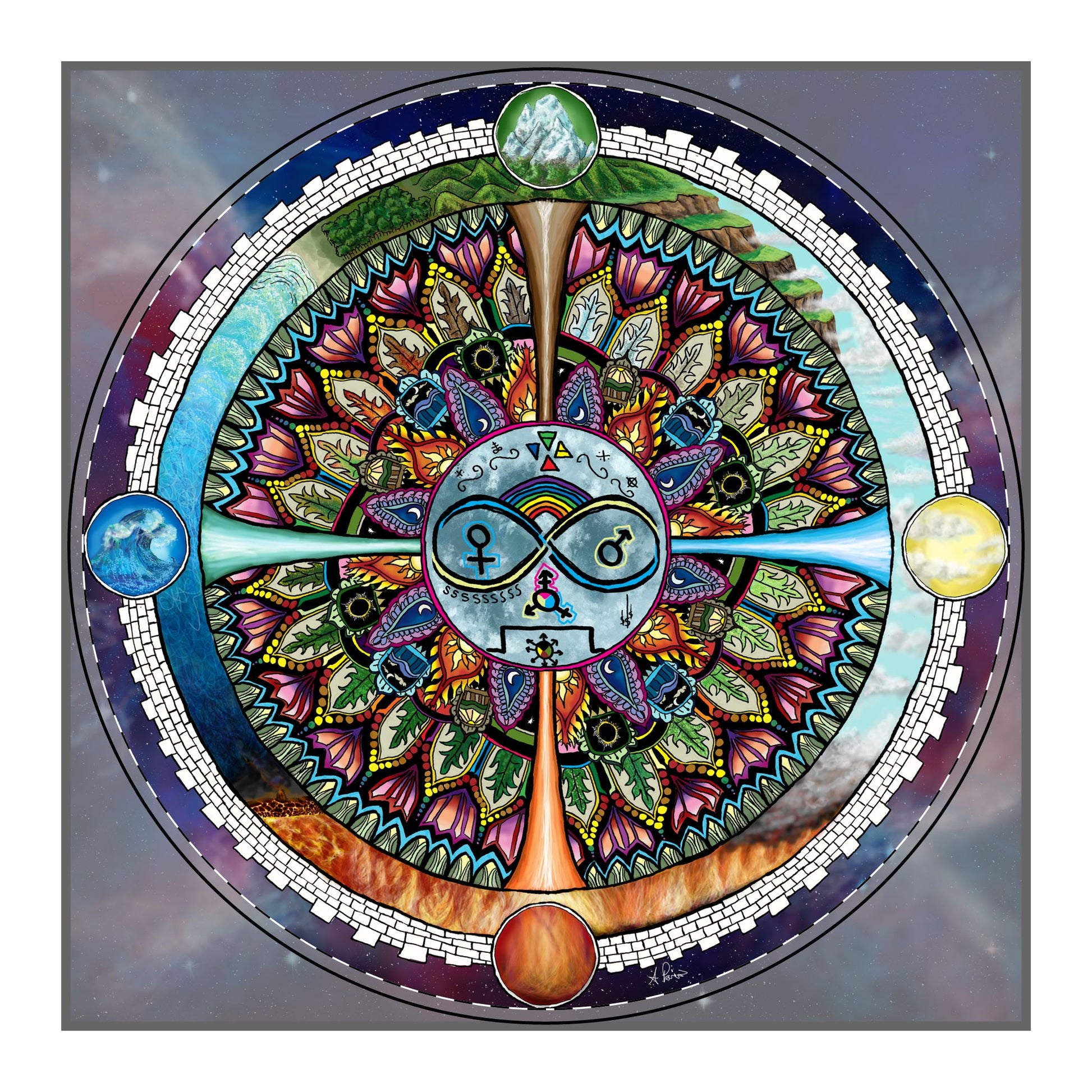 Drawing inspiration from the tranquil oases of nature found in nearby Fort Tryon Park amid Manhattan’s perpetual energy, this mandala roots itself in neopagan celebration of the interlocking cycles of time in nature, and the veneration of the moon[cite: 40, 41]. It is the observation of Luna’s monthly cycle which shape the mark of years in ways which inspired humanity to begin mastering agriculture which led to the rise of civilization. [cite: 41]