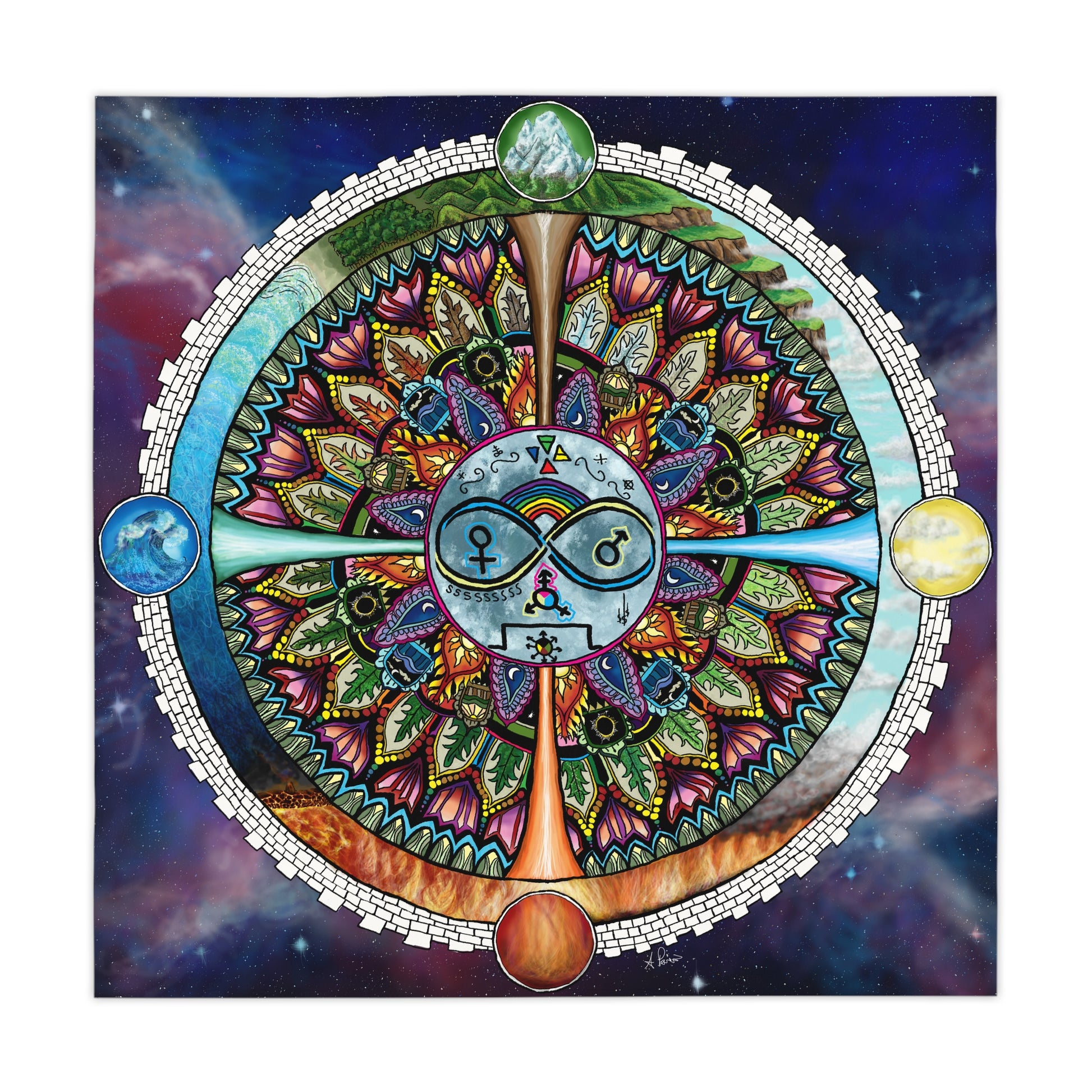 Drawing inspiration from the tranquil oases of nature found in nearby Fort Tryon Park amid Manhattan’s perpetual energy, this mandala roots itself in neopagan celebration of the interlocking cycles of time in nature, and the veneration of the moon. It is the observation of Luna’s monthly cycle which shape the mark of years in ways which inspired humanity to begin mastering agriculture which led to the rise of civilization.