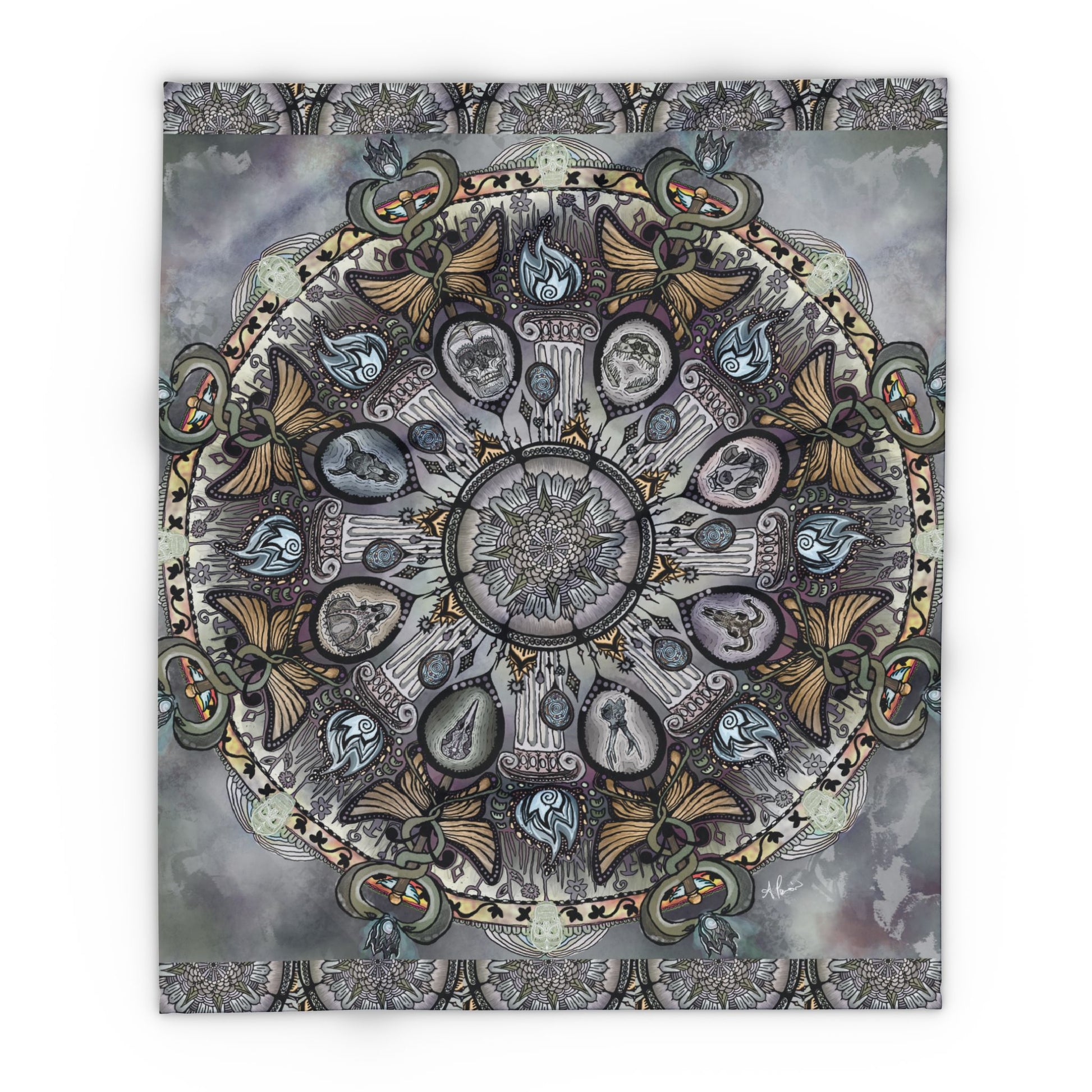 Inspired by anatomical sketching practice sessions for the human skull from reference as part of my drafting practice, the Memento Mori emerged as a mandala of the realms of death and the underworld, where warmth and color fades to gray, and the corpselight burns eternal.