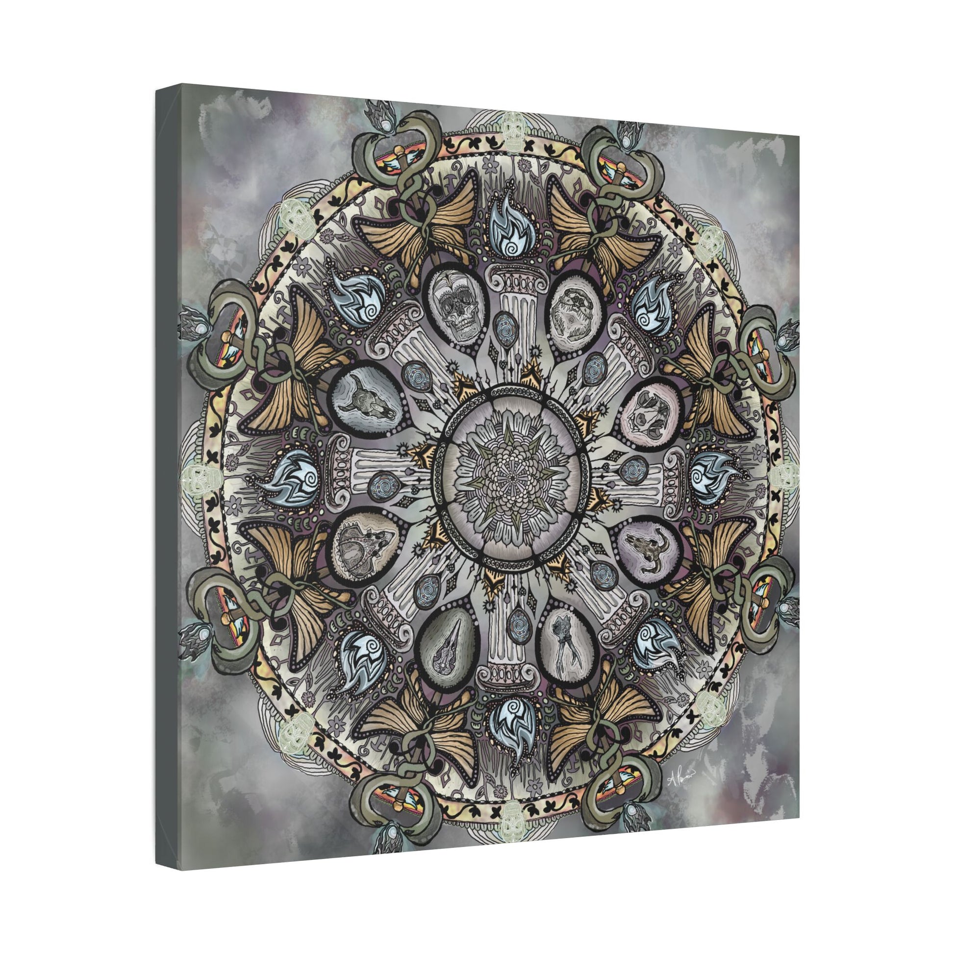 This mandala explored the foundations of the Underworld while also showing the magical ladder of transformation and rebirth both natural and hermetic. And within center, an array of different skulls for beast and human and dinosaur alike.