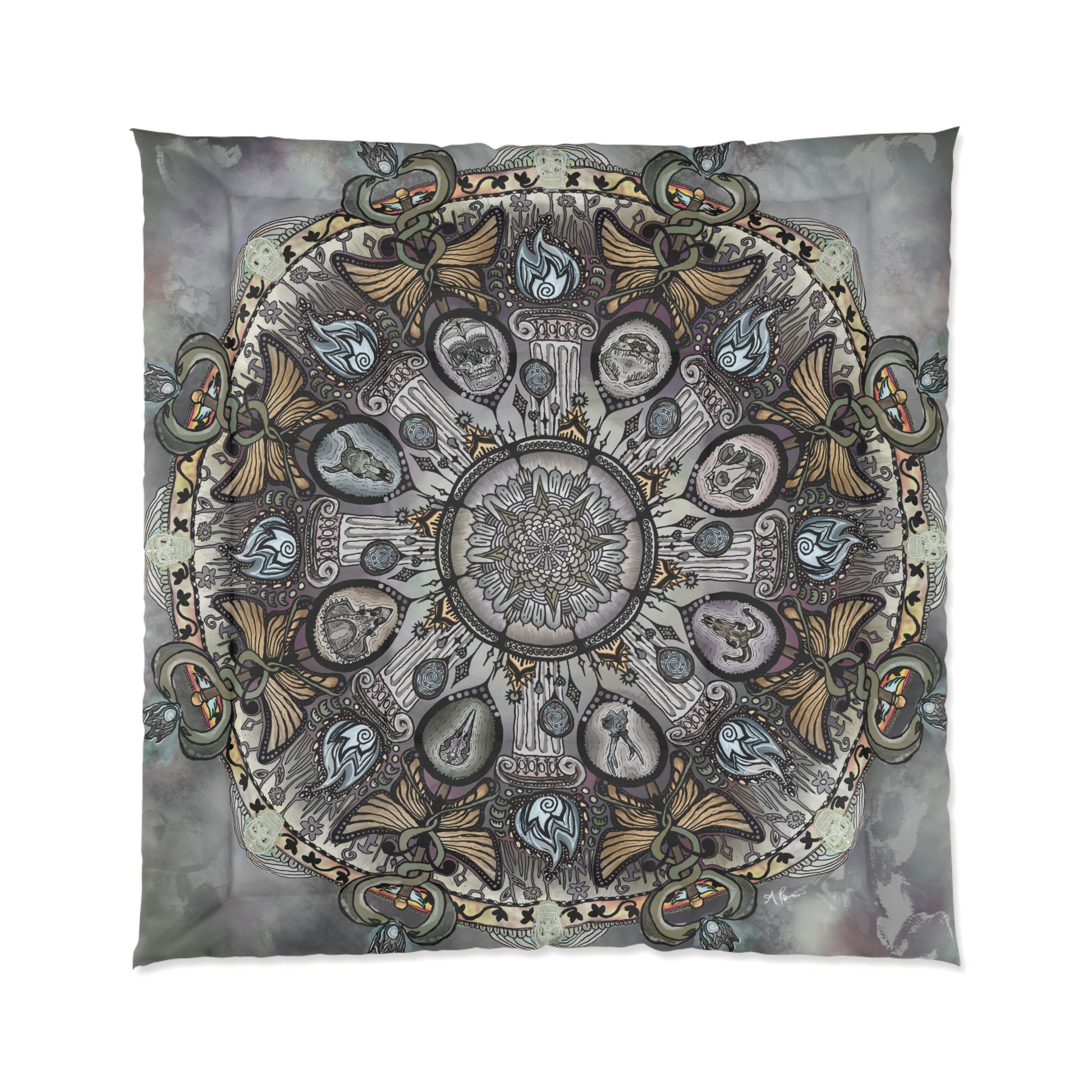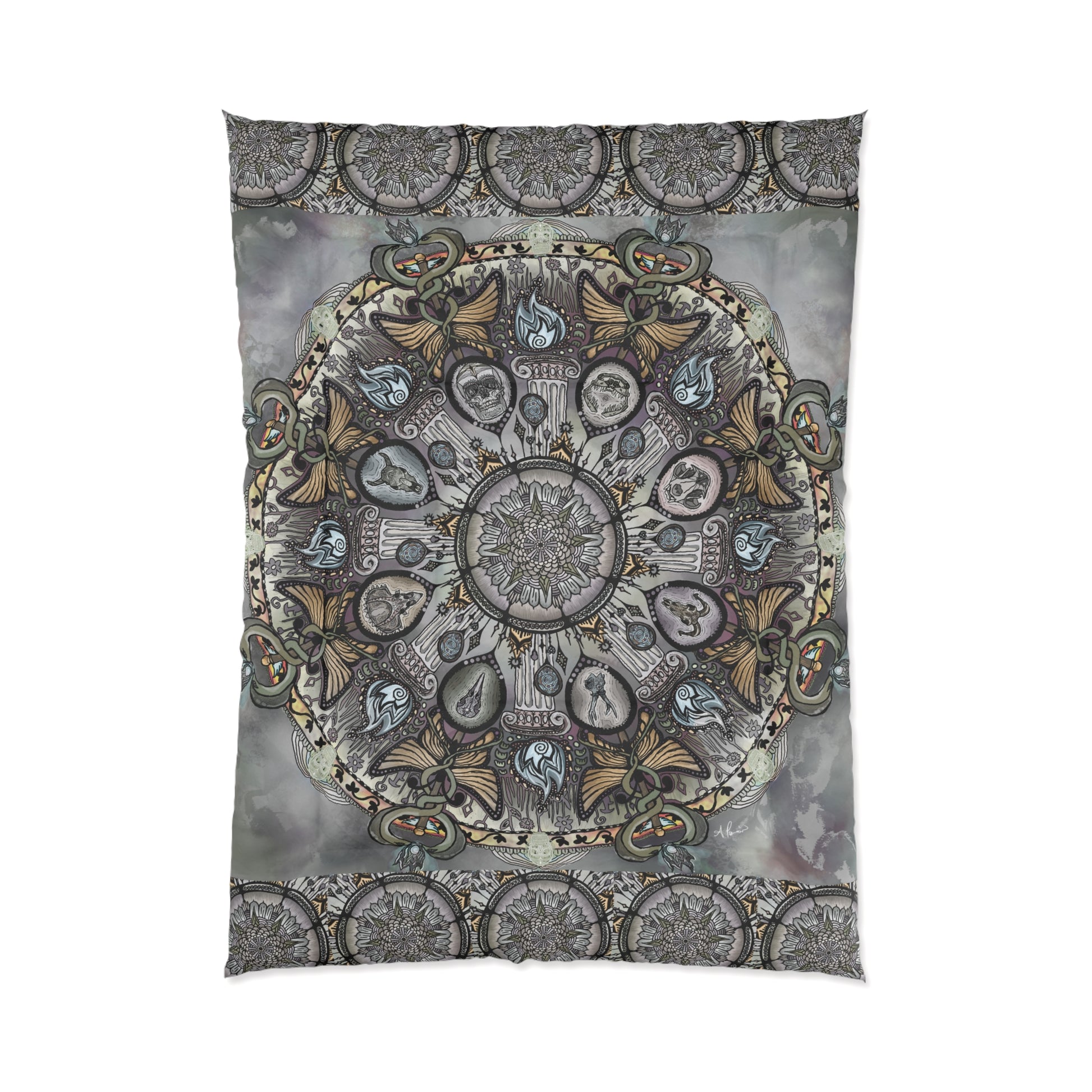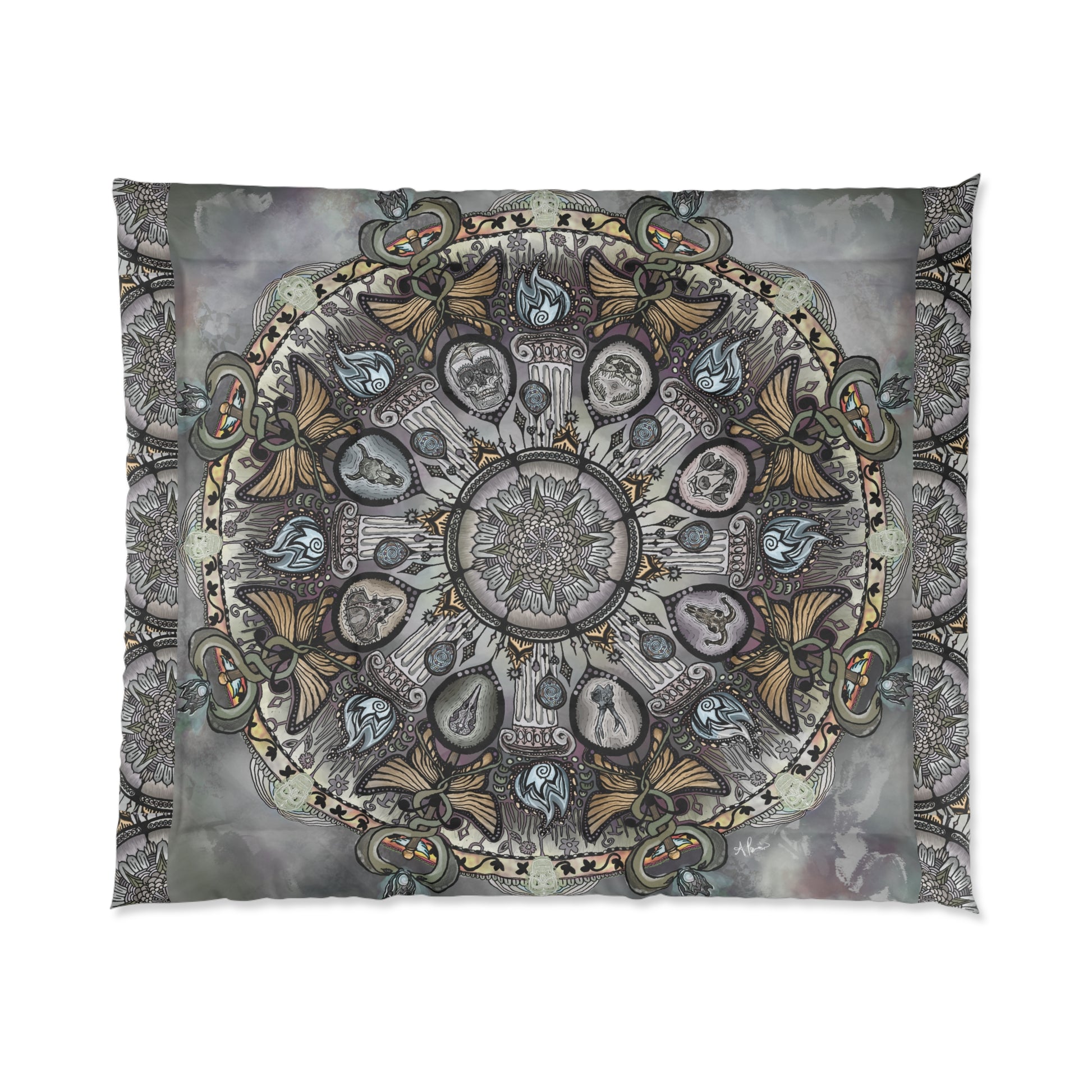 Inspired by anatomical sketching practice sessions for the human skull from reference as part of my drafting practice, the Memento Mori emerged as a mandala of the realms of death and the underworld, where warmth and color fades to gray, and the corpselight burns eternal.